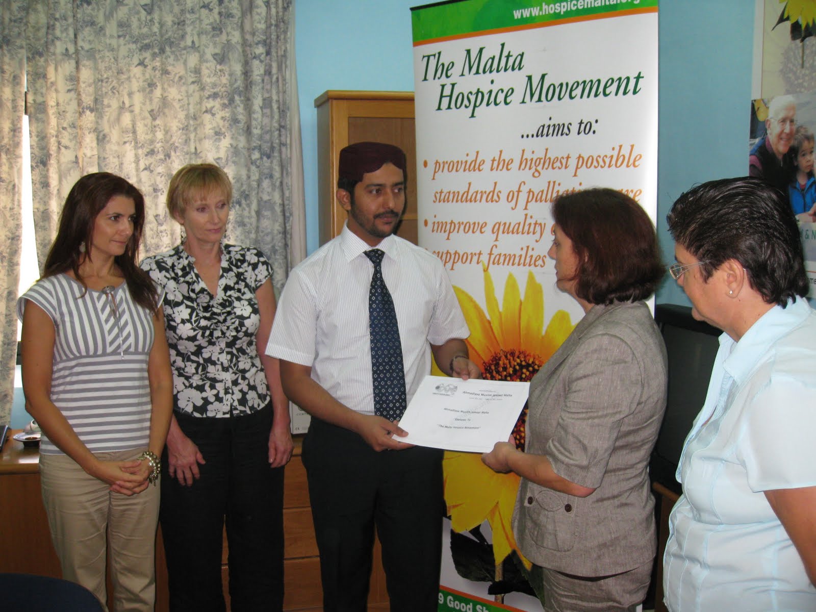 Laiq Ahmed Atif, the president and director of the Ahmadiyya Muslim Jamaat Malta visited the offices of The Malta Hospice Movement to make a contribution in the noble work of the Hospice Movement.