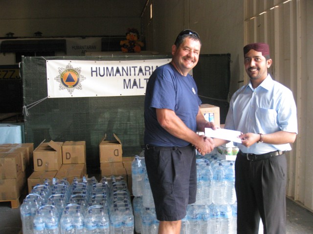 Laiq Ahmed Atif, president of the Ahmadiyya Muslim Jamaat Malta presented food items together with milk and water to the Civil Protection Department, as a Humanitarian Aid for Libya. He met with the officers at duty and presented them the items and explained about the services of the Ahmadiyya Community for humanity.