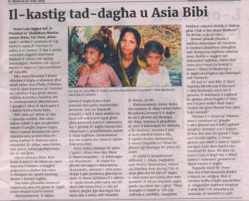 Nittama li l-Gvern tal-Pakistan wara s-sentenza tal-ġimgħa l-oħra għamel dak li kellu jagħmel, mingħajr dewmien u ta l-ħelsien lil Asia Bibi biex din tgawdi ħajja mal-familja tagħha. L-Gvern għandu jara wkoll li dawn il-liġijiet ma jiġux użati aktar kontra nies innoċenti fil-futur. Hu dmir tal-Gvern li jara li jieqef dan l-abbuż kontra l-minoranzi permess tal-liġijiet kontra d-dagħa.