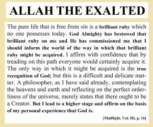 “The pure life that is free from sin is a brilliant ruby which no one possesses today. God Almighty has bestowed that brilliant ruby on me and He has commissioned me that I should inform the world of the way in which that brilliant ruby might be acquired. I affirm with confidence that by treading on this path everyone would certainly acquire it. The only way in which it might be acquired is the true recognition of God; but this is a difficult and delicate matter. A philosopher, as I have said already, contemplating the heavens and earth and reflecting on the perfect orderliness of the universe, merely states that there ought to be a Creator. But I lead to a higher stage and affirm on the basis of my personal experience that God is.” [Malfuzat, Vol. III, p. 16]