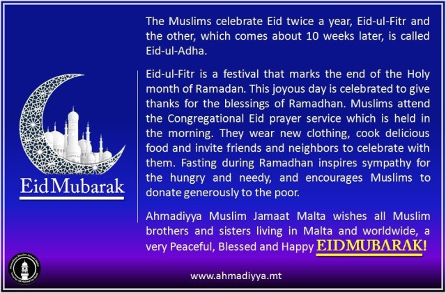 This entry was posted in #AhmadiyyaMalta, Ahmadiyya Malta, Ahmadiyya Muslim Jamaat Malta, Ahmadiyya: The True Islam, Eid-ul-Fitr, Fasting, www.Ahmadiyya.mt and tagged Ahmadiyya Malta, Ahmadiyya Muslim Jamaat Malta, Eid Mubarak, Eid Saeed, Eid-ul-Fitr, Laiq Ahmed Atif. Bookmark the permalink.