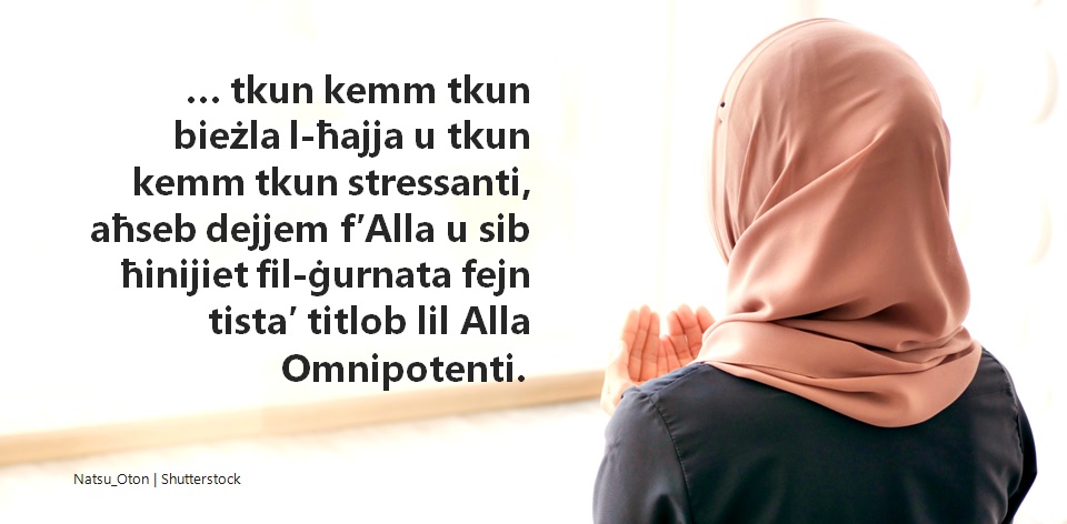 Waħda mill-aqwa affarijiet li għallimni missieri hija li tkun kemm tkun bieżla l-ħajja u tkun kemm tkun stressanti, aħseb dejjem f’Alla u sib ħinijiet fil-ġurnata fejn tista’ titlob lil Alla Omnipotenti.