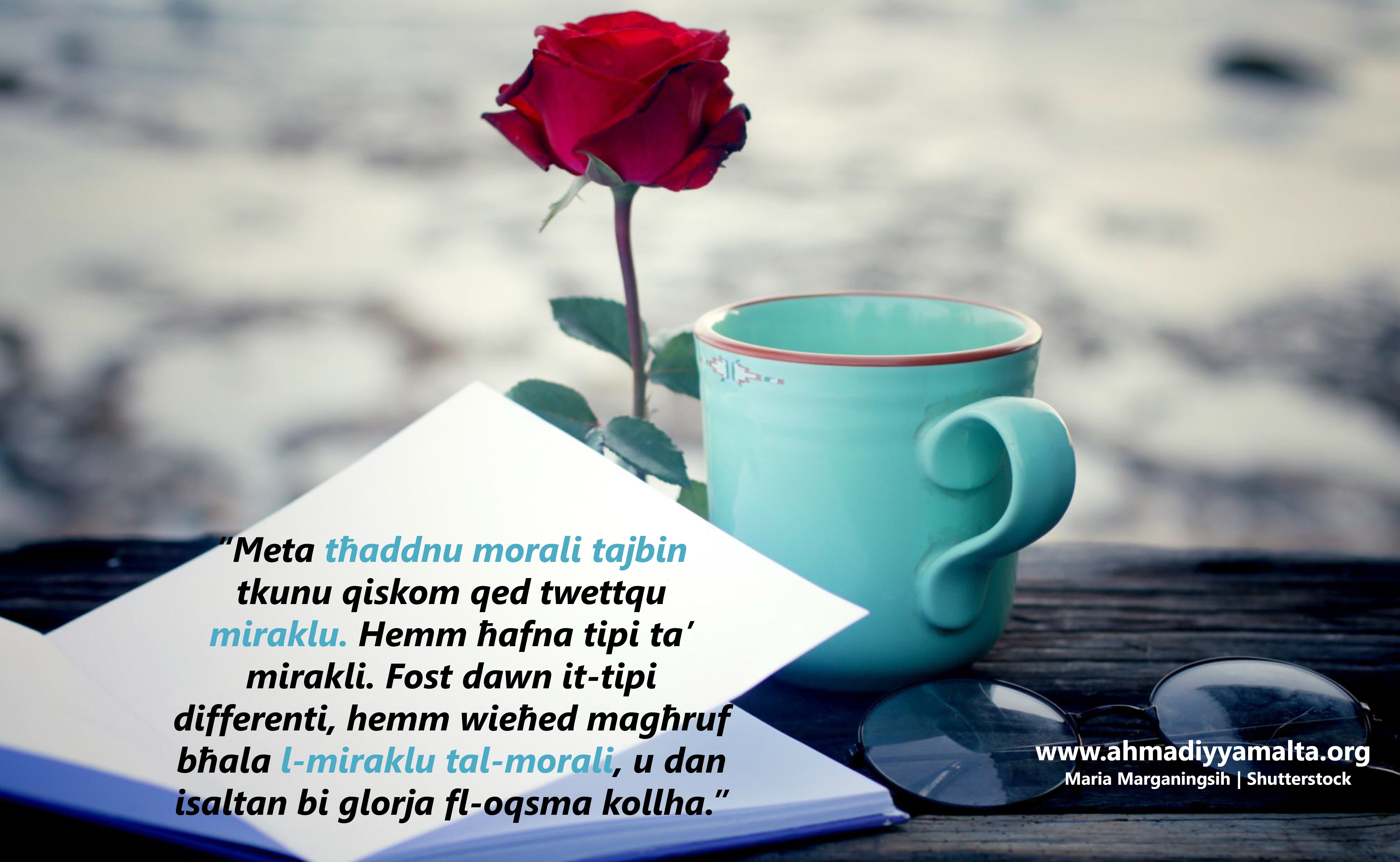 Għaldaqstant, huwa tabilħaqq dan il-mument fejn għandna nuru valuri morali għoljin, pjuttost “il-Miraklu tal-Morali” kif jistqarr il-Fundatur Qaddis tal-Komunità Ahmadiyya Musulmana. Huwa jgħid: