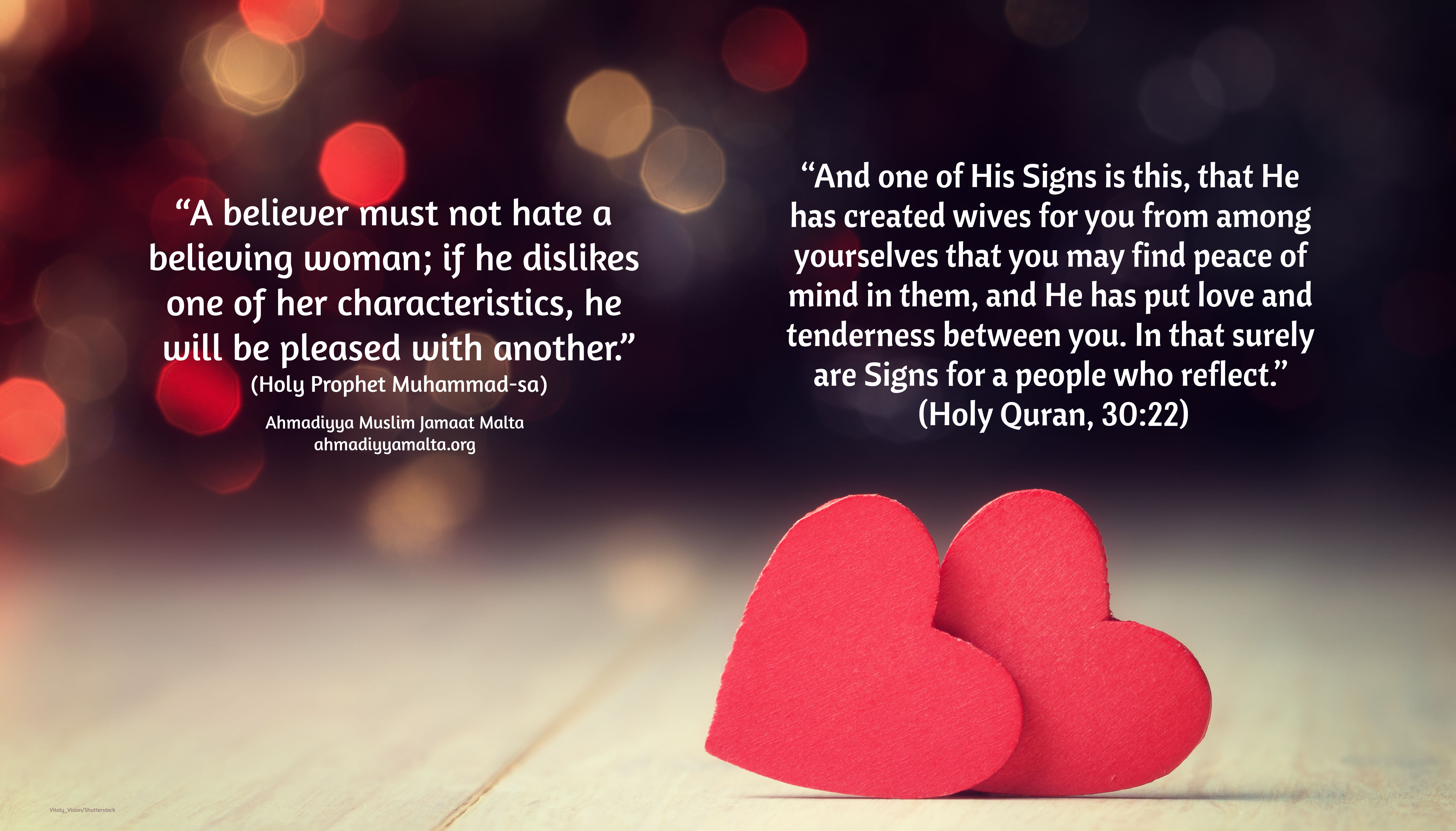 “And one of His Signs is this, that He has created wives for you from among yourselves that you may find peace of mind in them, and He has put love and tenderness between you. In that surely are Signs for a people who reflect.” (Holy Quran, 30:22)