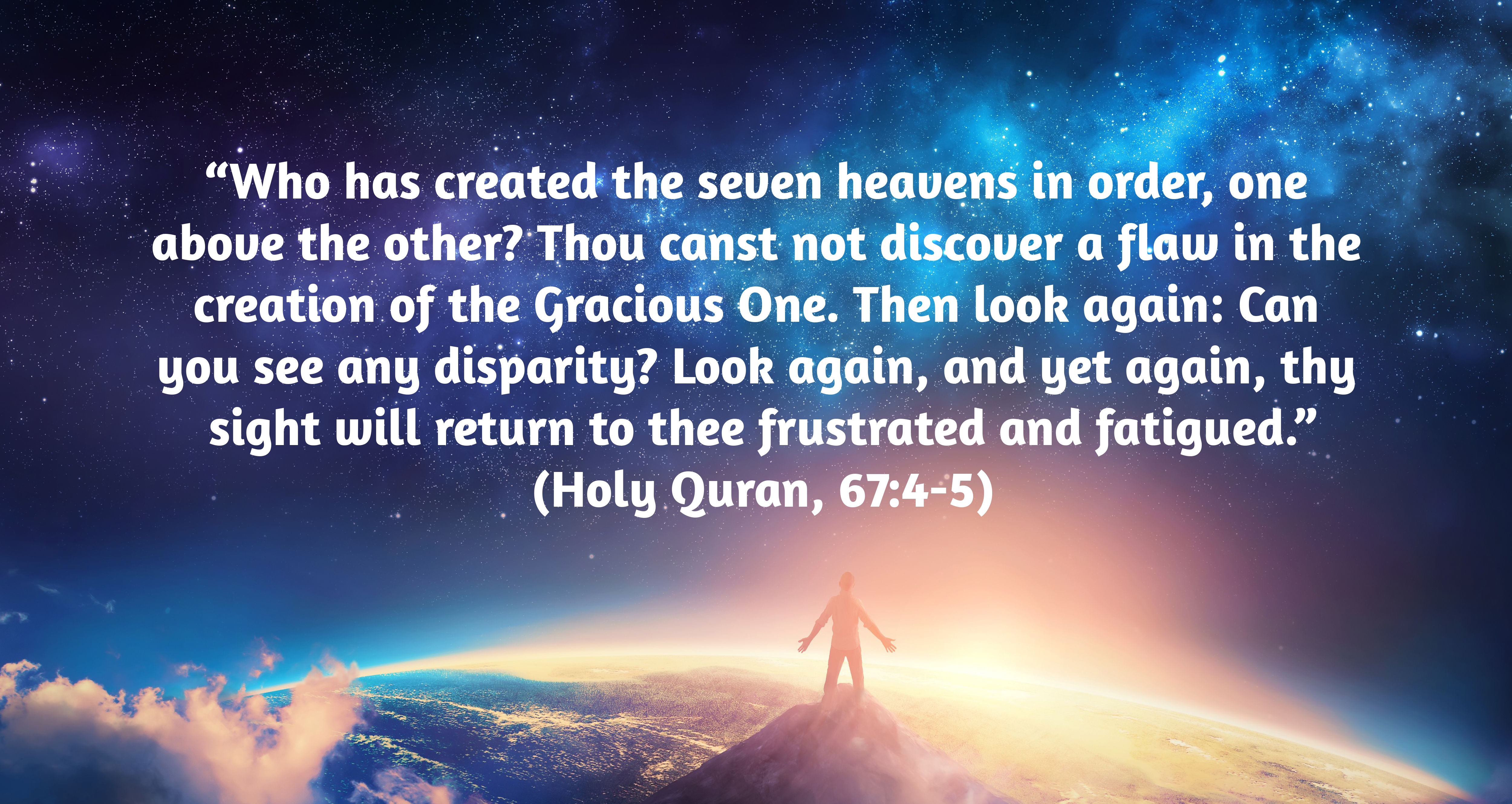 Alla jgħid fil-Koran Imqaddes dwar il-ħolqien u jgħid li: “Alla ħalaq seba’ smewwiet f’ordni, fuq xulxin. Ma tistax tara ebda nuqqas jew difett fil-ħolqien ta’ Alla, il-Ħanin. U erġa’ ħares! Tara xi difett jew disparità? Imbagħad erġa’ ħares għal darb’oħra! Il-ħars tiegħek se jerġa’ lura lejk umli, imħawwad u għajjien (wara li ma sab ebda nuqqasijiet fil-ħolqien).” (67:4-5)