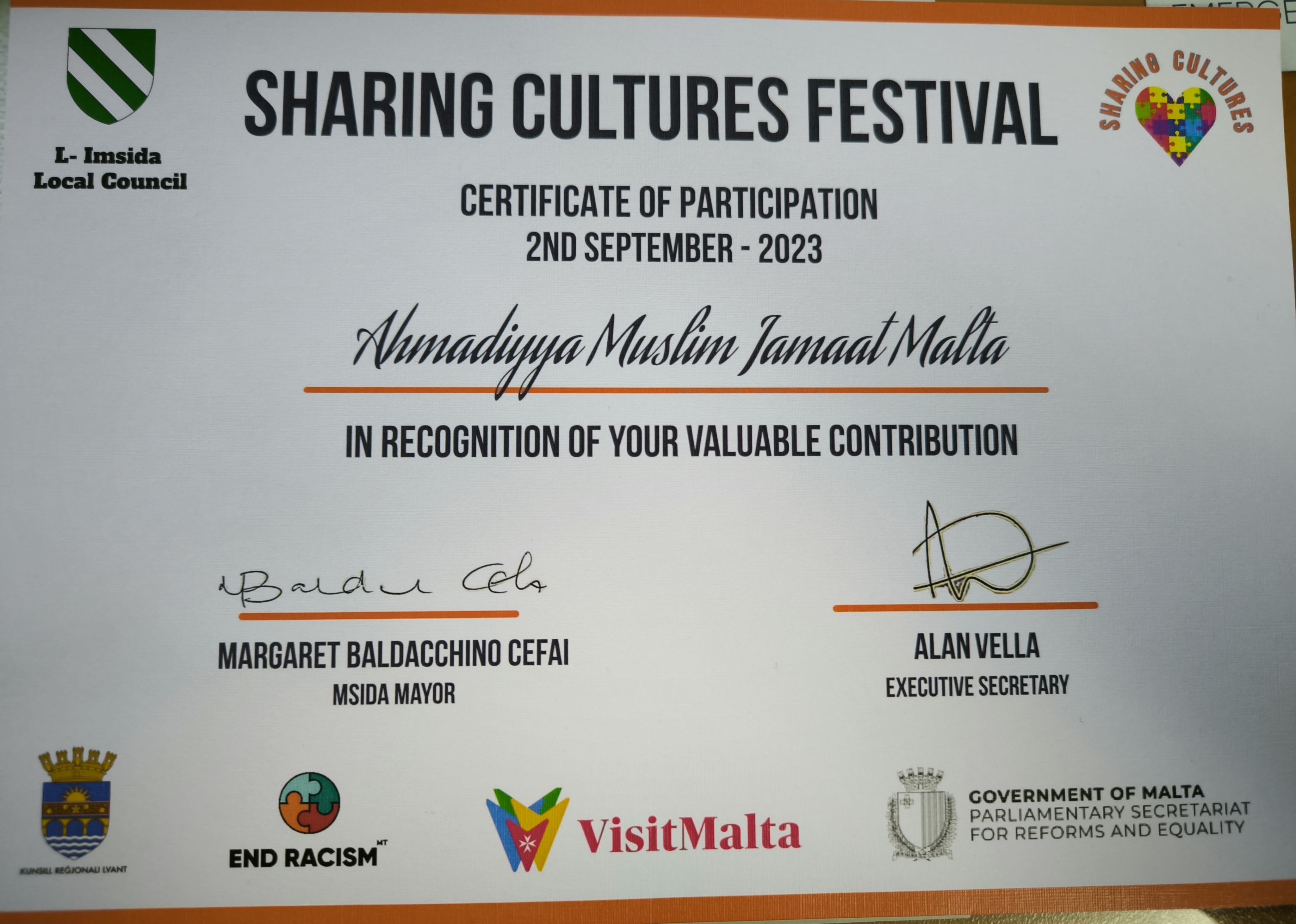 Certificate of Appreciation Msida Council