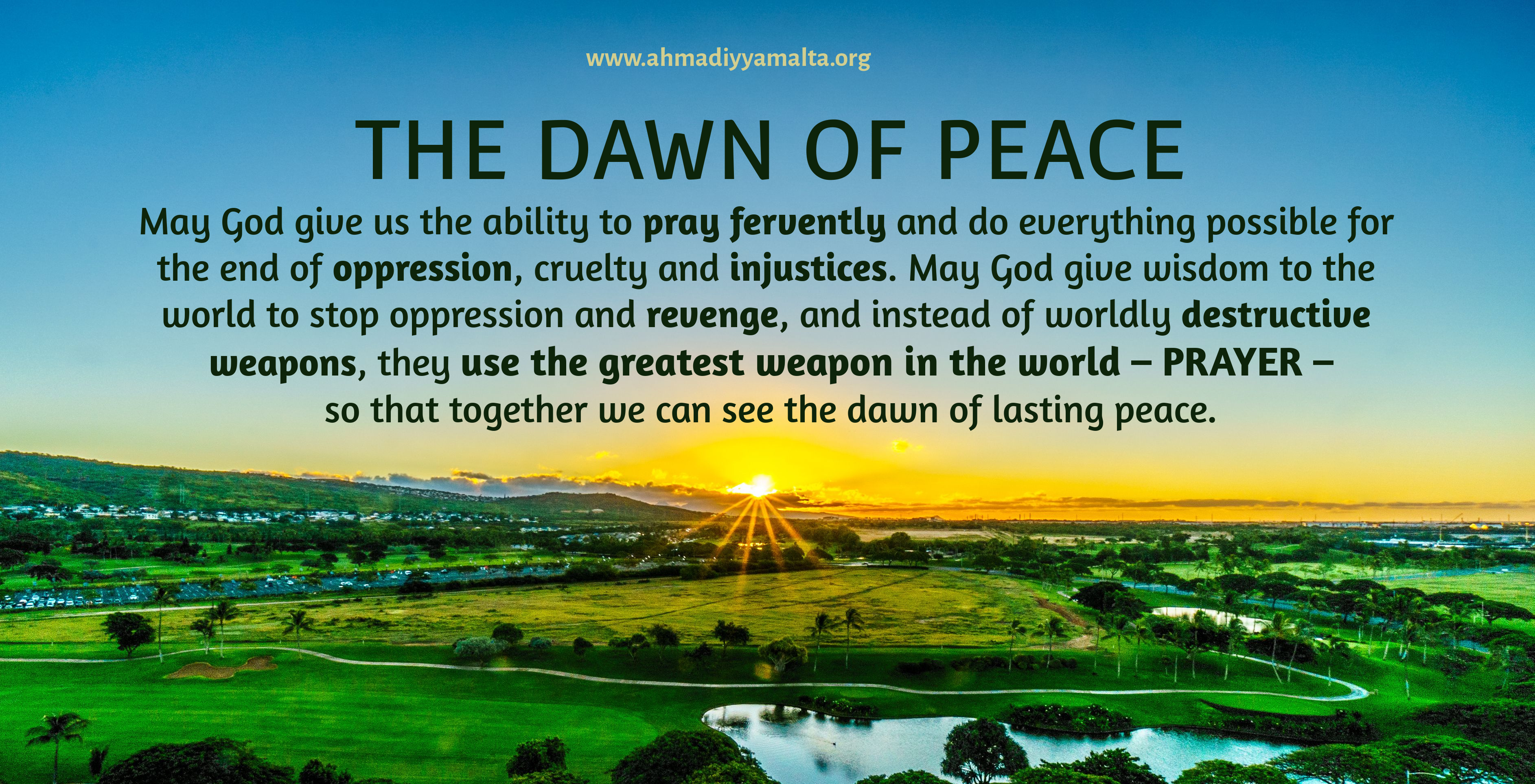 May God give us the ability to pray fervently and do everything possible for the end of oppression, cruelty and injustices. May God give wisdom to the world to stop oppression and revenge, and instead of worldly destructive weapons, they use the greatest weapon in the world, prayer, so that together we can see the dawn of lasting peace. Laiq Ahmed Atif | amjmalta@gmail.com