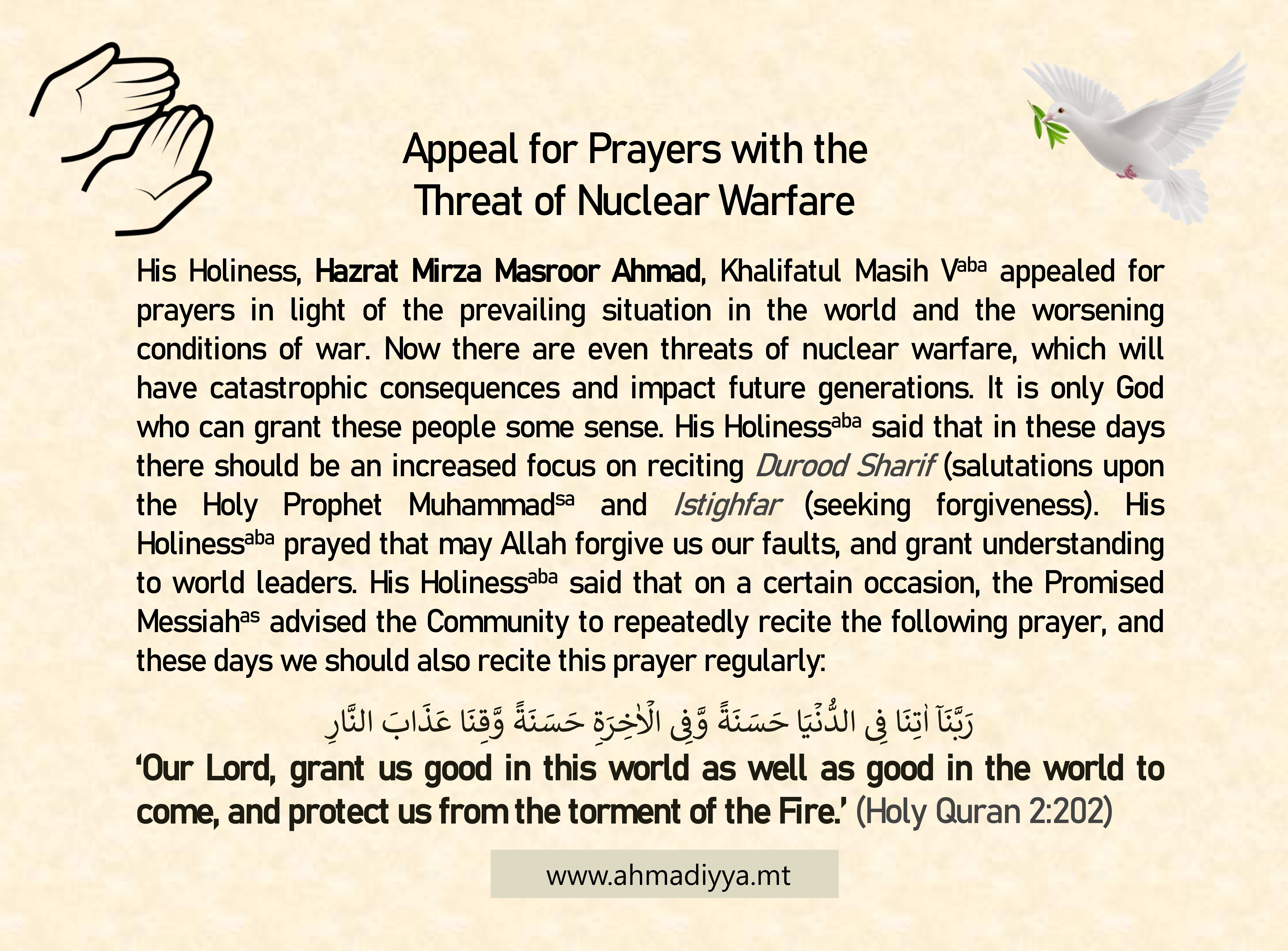 “I pray that the world’s leaders pay heed to the need of the hour and value, above all else, their obligation to ensure the peace and stability of the world. May Allah the Almighty protect all innocent and defenceless people and may true and lasting peace in the world prevail. Ameen.” HAZRAT MIRZA MASROOR AHMAD – Khalifatul Masih Vaba