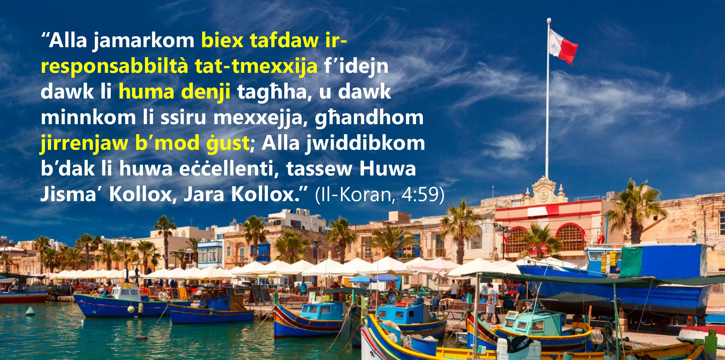 Jekk tmur kullimkien fid-dinja, issib li dawn il-kwalitajiet tajba jinsabu fil-Musulmani Aħmadin ġenwini kollha… L-eżempju li nsegwu huwa dak tal-Fundatur tal-Iżlam, il-Qaddis Profeta Muħammadsa, u l-istruzzjonijiet li jiggwidawna huma dawk tal-Koran Imqaddes.(ii) (Il-Kriżi Dinjija u t-Triq għall-Paċi, p. 52 & 74-75) – READ Original Article in Maltese