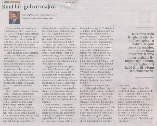 “Din il-moskea hawn fl-Irlanda nbniet ukoll għall-istess raġuni [biex tkattar il-paċi u l-ġustizzja vera f’kull livell tas-soċjetà]. Ġiet imsejħa ‘Masjid Maryam’. Maryam, jew Marija kif inhi magħrufa magħkom, hija meqjuma ħafna mill-Musulmani bħalma hi mill-Insara.