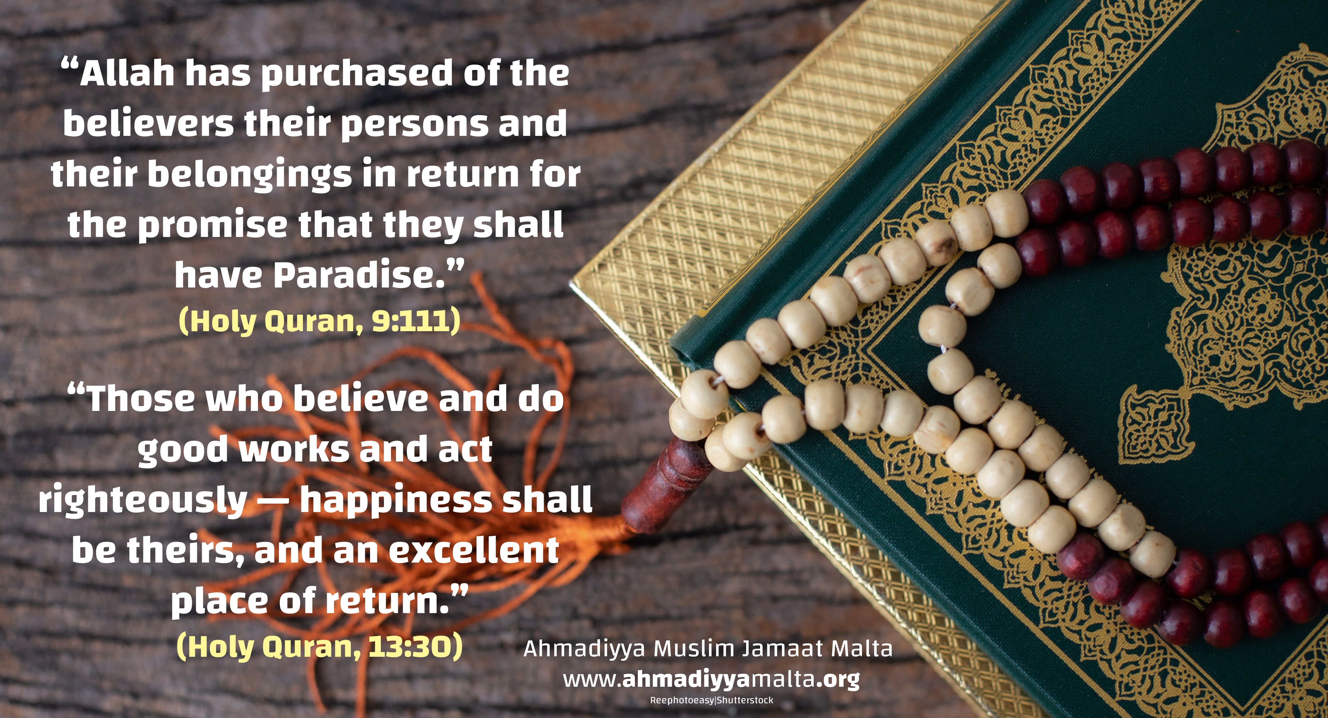 Il-Koran Imqaddes, f’Kapitlu 4, Vers 136, jagħtina prinċipju li jiswa mitqlu deheb u lezzjoni li tiggwidana f’dan. Din tgħid li biex nilħqu livell għoli ta’ ġustizzja, jekk jinqala’ l-każ li jkollna nixhdu kontra tagħna nfusna, kontra l-ġenituri, kontra l-egħżeż qraba u ħbieb, mela dan irridu nwettquh. Din hi l-veru ġustizzja fejn l-interessi personali jiġu mwarrba fil-ġenb għall-ġid komuni.